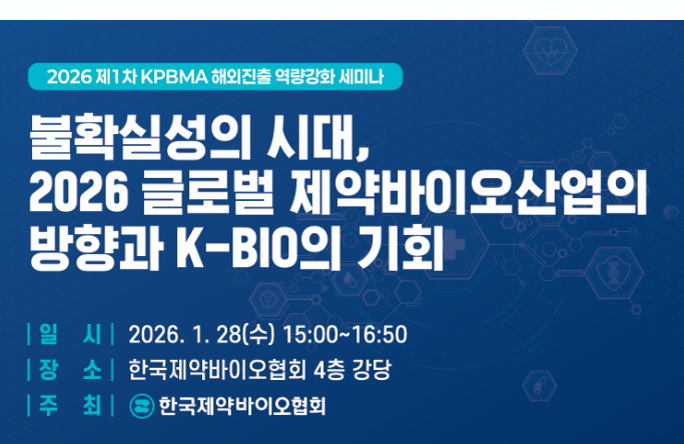 협회는 오는 1월 28일 ‘불확실성의 시대, 2026 글로벌 제약바이오산업의 방향과 K-BIO의 기회’ 세미나를 개최합니다. 이번 세미나에서는 2026년 글로벌 제약바이오산업 핵심 트렌드와 변화를 짚어보고, 국내 기업의 전략적 대응 방향을 제시할 예정입니다. 아울러 JPMHC 2026의 현장 경험과 주요 이슈를 공유하는 자리도 마련됩니다.
