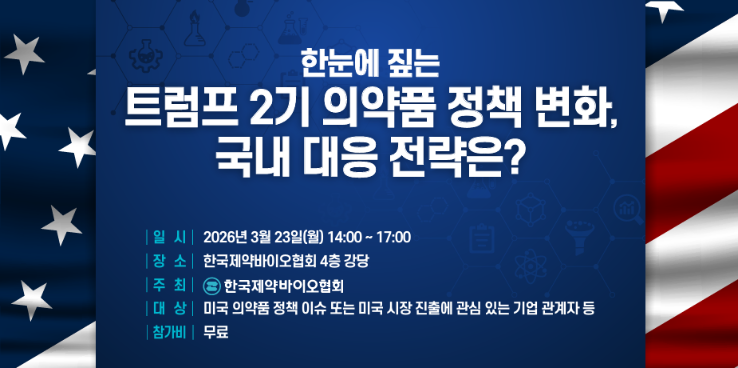 협회는 오는 3월 23일 「한눈에 짚는 트럼프 2기 의약품 정책 변화, 국내 대응 전략은?」 세미나를 개최합니다. 이번 세미나에서는 트럼프 2기 행정부 출범 이후 빠르게 변화하는 미국 의약품 정책 환경을 체계적으로 정리하고, 국내 산업 및 기업에 미치는 영향을 분석하여 실질적인 대응 방향을 공유할 예정이오니, 많은 참여 바랍니다.