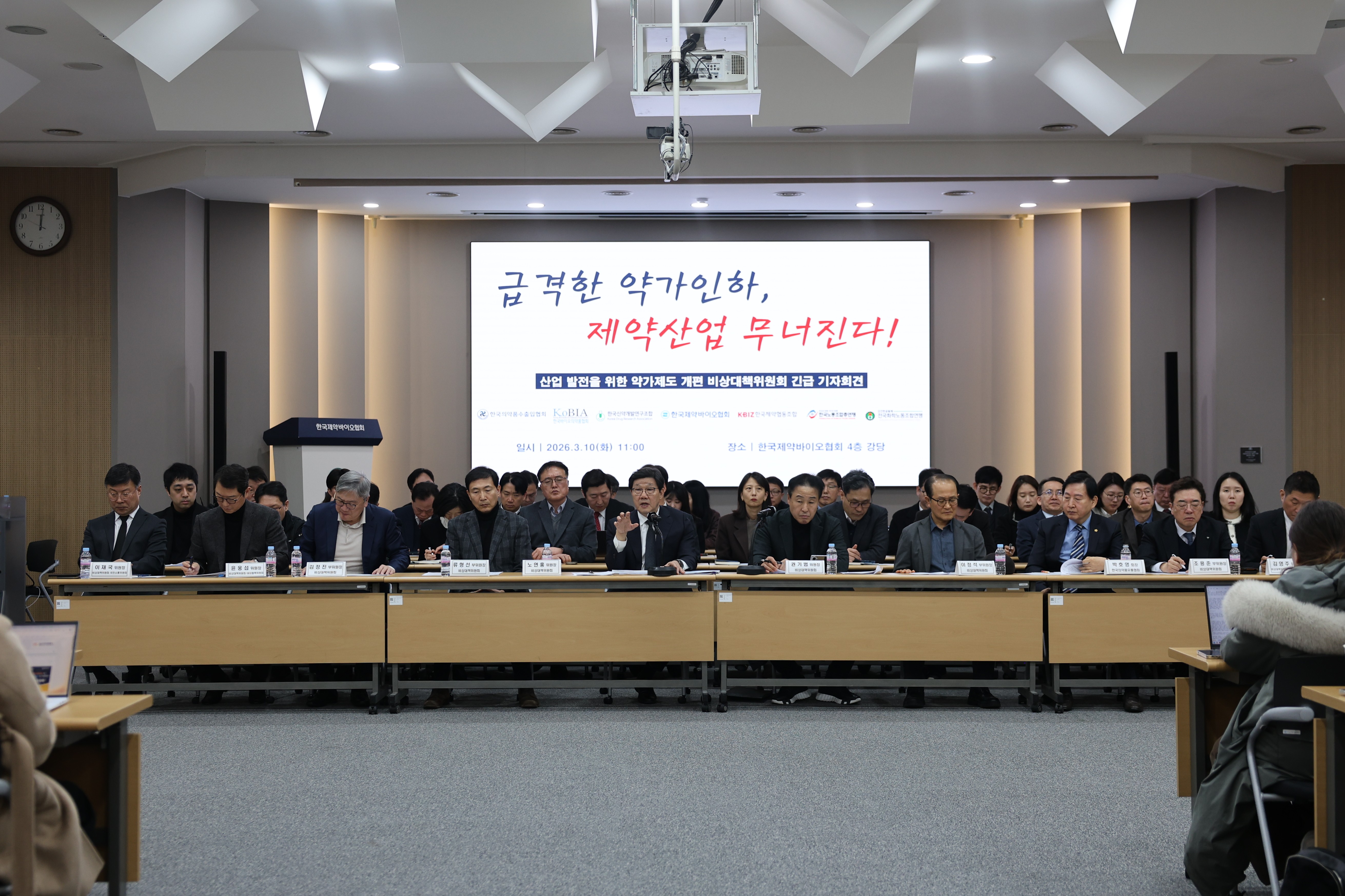 정부의 약가제도 개편에 대응하기 위해 구성된 비상대책위원회(비대위)는 참여 단체와 제약사 대표 등 50여 명이 참석한 가운데 3월 10일 긴급 기자회견을 열고 산업계의 입장을 발표했습니다. 비대위는 중동 사태에 따른 유가·환율 급등 등 대외 여건이 악화되는 상황에서 급격한 약가 인하가 추진될 경우 제약바이오산업의 투자와 생산 기반이 위축되고 의약품 공급 안정성에도 영향을 미칠 수 있다고 지적했습니다.